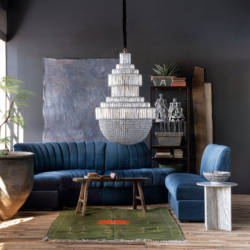 Our best-selling Estelle Modular Sofa is now available in a rich Navy hue, adding depth, sophistication, and timeless style to any space. Designed for comfort and flexibility, its modular design allows effortless styling and anchors the room with poise. Paired with our new empire-style chandeliers, the look is elevated by cascading glass prisms, antique brass detailing, and a warm golden glow inspired by classic European design.