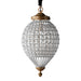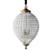 Featuring clear glass beads threaded on iron wiring, the Avignon Teardrop Chandelier captivates with its swooping oval  shape and delightful play of texture. Its top and bottom are capped with antique-brass-colored metal. The Chandelier hangs from a chain and comes with a black velvet cover. Available in Small and Large.