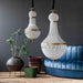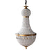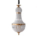 The empire-style Bezier Prism Chandelier is intricately composed of clear glass beads threaded on iron wiring that bestows dazzle and structure. The Bezier Prism Chandelier is divided into three sections by a decorative antique-brass colored iron banding that gives it a Golden Age feel.  The top and bottom are capped with antique-brass-colored finials. The Chandelier hangs from a chain and comes with a black velvet cover. Available in Small, Medium, Large and Extra Large.