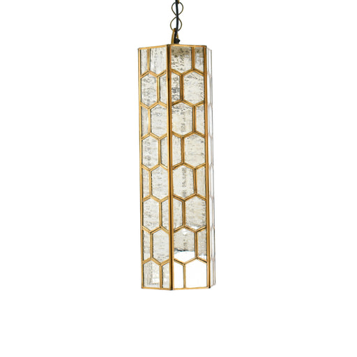The Sophisticate Pendant gold has a modern meets 1970s appeal. The hexagonal, antique glass panes of the enclosed "shade" cast an ambient hue, whil...