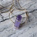 At the center of the gold-plated Wire Cuff Bracelet sits a single biterminated  stone crystal that is 2.5 inches in height. This striking arm band easily adjusts to the desired fit. The Wire Cuff Bracelet is available in white quartz, amethyst, and rose quartz.
