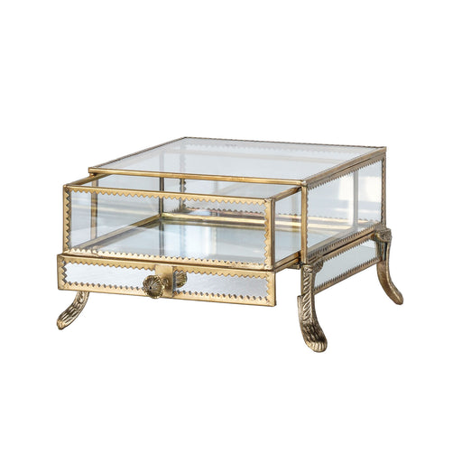 The antique-brass-finished claw feet and frame provide a stately stage for the glass-walled Ormolu Case with Drawer. The brass-handled knob easily ...
