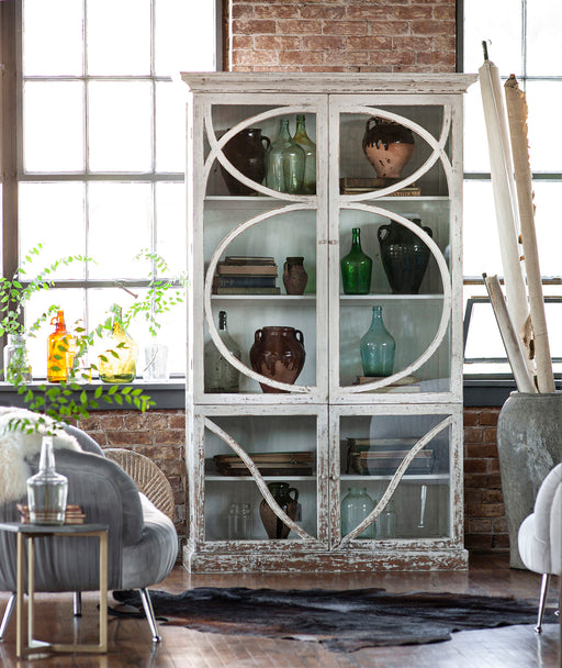 The façade of the Luna Hutch is striking with the curved pine wood artistically criss-crossing the four glass doors. With five shelves, the Luna Hu...