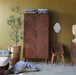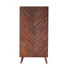 The broad-plank mango wood is masterfully assembled to create a breathtaking patchwork design on the facade of the Fissio Armoire. The tall, two-door Armoire is finished in a medium brown and has an open bottom with tapered wood legs. The interior includes three shelves to organize clothes, linens, or games.