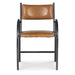 Contrasting geometric lines with vintage leather seating, the Alex Dining Chair combines the symmetry of Art Deco with hints of western-style upholstery. The industrial iron frame contrasts rounded arms with a horizontal back stretcher and straight lines on the chair back.