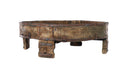 This vintage-inspired, hand-carved wood and iron table was used to grind grain or corn into a fine powder for traditional Indian cooking. Each ornate table is unique in design and condition.