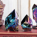The Points Collection features a variety of natural minerals with a raw stone, a roundish base, and a triangulated, pointed top. The number of triangular peaks varies based on the size of the mineral. The molten lave black obsidian stone is bonded with other precious metals to achieve its rainbow "aura." The Aura Black Obsidian Point is a cascading array of blues, greens, and magentas over smooth and textured surfaces. This is a sculptural piece of wonder. Available in Small and Large.