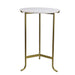 Understated and elegant, the Occasions Occasional Table is topped with a round, white-marble top that is sealed for daily use. The three-legged brass base has a bistro appeal that is simple and versatile.