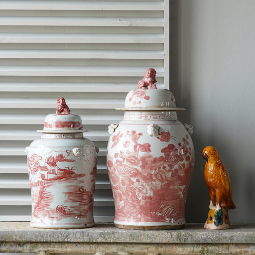 Ablaze with a dramatic mountain landscape, the soft red coloration of the Jingdezhen Hand-Painted Temple Jar, Red with Mountain, offers a majestic ...