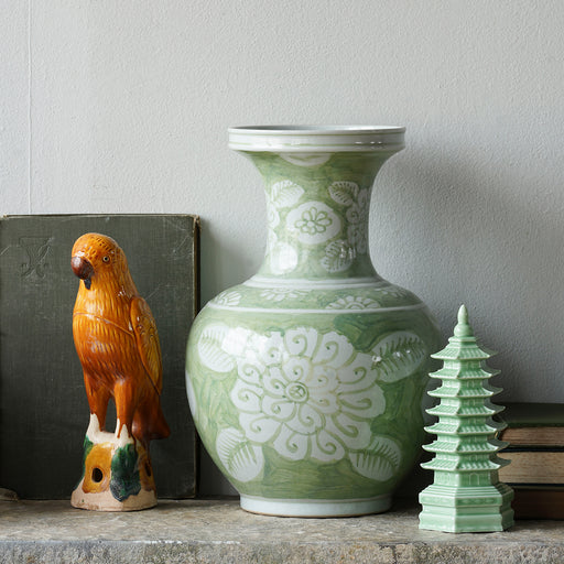 Large leaves and blooms abound on the sage green and white colored Jingdezhen Hand-Painted Vase, Green with Flowers. This antique reproduction porc...