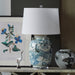 The base of the Jingdezhen Porcelain Hand-Painted Folk Lamp is an antique reproduction of a tall spice jar. It includes small handle accents at the mouth of the vase where the bulb is positioned. The wispy navy strokes on the white ceramic make this lamp perfect for bedrooms or places of relaxation. The Jingdezhen Porcelain Hand-Painted Folk Lamp is topped with a white linen drum shade and uses E26/27 bulbs.
