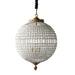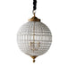 Featuring clear glass beads threaded on iron wiring, the Avignon Prism Chandelier captivates with its elegant round shape and delightful play of texture. Its top and bottom are capped with antique-brass-colored metal. The Chandelier hangs from a chain and comes with a black velvet cover. Available in Small, Medium, and Large.