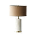 The round pillar of the Bella Table Lamp is shaped from multiple white marble pieces placed to give a basketweave appearance. The marble pillar sits atop a brass base and sports a brass frame for the light and shade. The Bella Table Lamp is a handsome ensemble topped with a caramel-hued rattan shade and light brown piping on top and bottom.