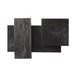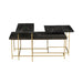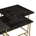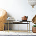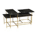 The brass-finished iron legs create architectural intrigue with their intersecting geometrical shapes. The Focal Display Coffee Table is capped with three separate black-stained mango wood table tops. These rectangular sections run horizontally and vertically for a staggered composition that adds layering and appeal.