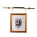 The Gallery Art Hanger with Light is an industrial-inspired apparatus for showcasing key art pieces. The brass rod runs through two circular brass wall mounts. At the center of the hanging rod is a downlit rectangular light. The Gallery Art Hanger includes two brass chains that attach to brass hooks for mounting to the back of a frame. Frame not included.