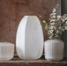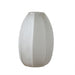 The Lena Hand Cut Glass Vessel Tall has a pineapple shape with long, ridged cuts to add geometric interest. Hand-carved, the craftsmanship is evident in the opaque white, satin-finished vessel.