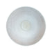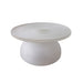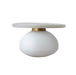 The white-frosted Magna Glass Low Table features a round tabletop with a squat, bulbous base. The tabletop is ridged with circular rings that expand from the center to the very edge. The tabletop has an antique brass join to the horizontally ridged-glass base.