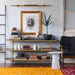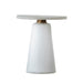 The white-frosted Magna Glass Side Table features a round tabletop with a conical-shaped base. The tabletop is entrancing with its ridged rays of lines that burst forth from the center. The tabletop has an antique brass join to the vertically ridged-glass base.
