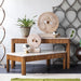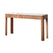 The Tambour Table Collection is shaped from mango wood slats atop a solid frame. The wood is finished with plastic paint, providing a deep caramel hue. The textured base is topped with a cream-and-beige-veined panther marble. The Tambour Collection features a rectangular Desk, Coffee Table, Console Table, and a square Side Table.