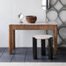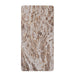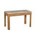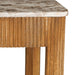 The Tambour Table Collection is shaped from mango wood slats atop a solid frame. The wood is finished with plastic paint, providing a deep caramel hue. The textured base is topped with a cream-and-beige-veined panther marble. The Tambour Collection features a rectangular Desk, Coffee Table, Console Table, and a square Side Table.