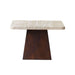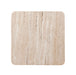 The Trenton Table has a trapezoid-shaped base crafted from mango wood finished in a rich brown. The tabletop is a contrasting cream-toned travertine marble. The square-shaped Trenton Table is available as a Side Table and Coffee Table.