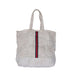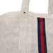 Fashioned from a natural-hued canvas tent, the Upcycled Tent Tarp Market Bag is an over-the-shoulder bag with a bold black-and-red-striped ribbon that runs vertically along its front. Four brass upholstery pins ensure the handle straps are secure. The Upcycled Tent Tarp Market Bag is a large, durable bag for toting groceries or supplies for outdoor activities.