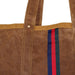Fashioned from a brown-toned waxed cotton canvas, the Waxed Canvas Market Bag is an over-the-shoulder bag with a bold black-and-red-striped ribbon that runs vertically along its front. There are four brass upholstery pins that ensure the handle straps are secure. The Waxed Canvas Market Bag is a large, durable bag for toting groceries or supplies for outdoor activities.