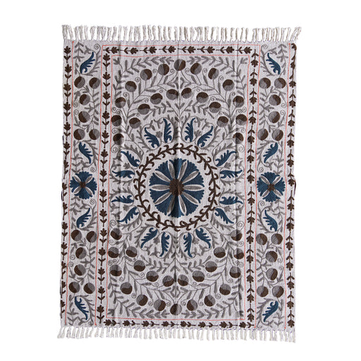 The natural-hued cotton base of the Handloom Slub Cotton Throw with Suzani Embroidery crisps with the silver, brown, and slate blue hues of the flo...