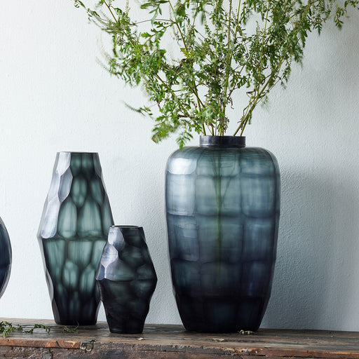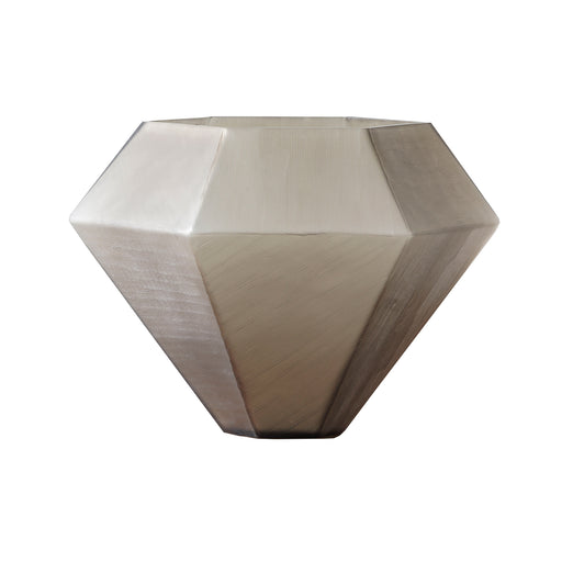 The hand-carved Poly Cut Glass Vase is a 5-sided vessel with polygon pairs that widen at the center and narrow at the ends. The exterior is texturi...