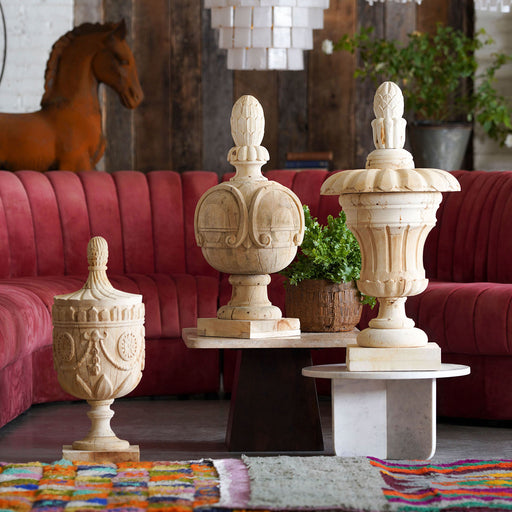 Made of sandblasted, bleach wood, the Ribbed Estate Finial is a hand-carved accent with an 18th-century French appeal. The plumed planter-style des...
