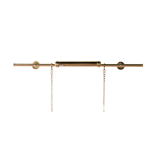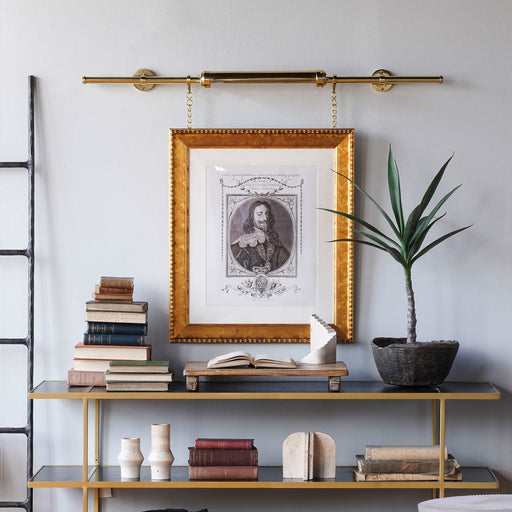 The Gallery Art Hanger with Light is an industrial-inspired apparatus for showcasing key art pieces. The brass rod runs through two circular brass ...