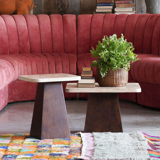 The Trenton Table has a trapezoid-shaped base crafted from mango wood finished in a rich brown. The tabletop is a contrasting cream-toned travertin...