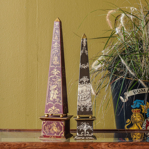 Dressed in two shades of rich red indicative of ancient emperors, the Hand-Painted Chinoiserie Obelisk is accented with distinct gold-hued decorati...