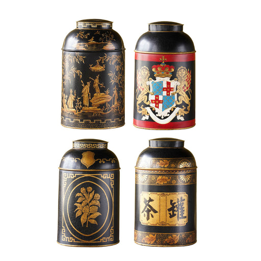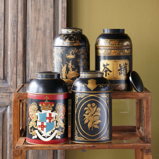 Iron-forged and dressed in black paint, the Hand-Painted Tea Canisters, Set of 4, each feature a different design. Three gold-and-black chinoiserie...