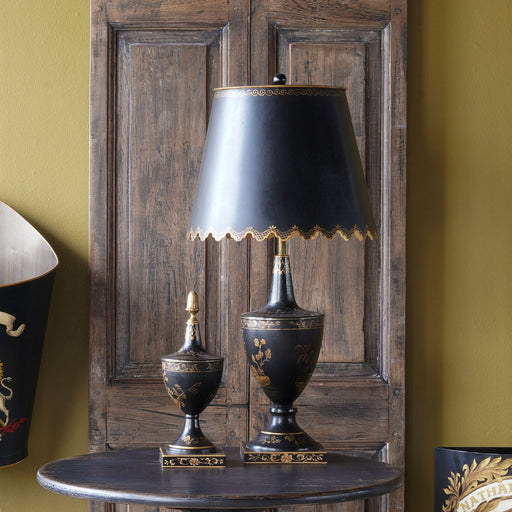 With a black-and-gold finial base, the Hand-Painted Toile Lamp also features a black lamp shade with thin-lined gold-painted designs around the sha...