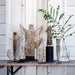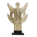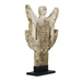 Outstretched and open, the Stone Idol Statue on Base is symbolically uplifting in form while the face of the figure remains stoic. The Stone Idol Statue on Base's façade is hand-carved with Pacific-inspired ornamentation. The cream colored stone has dark veining that makes a fascinating modern accent.