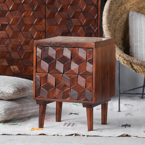 The stunning 3D effect of the Cubes Nightstand is breathtaking. The frame and drawers are crafted from acacia wood with a light satin finish. The t...