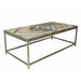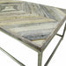 Intricate geometric construction in each table top design is the signature of this collection. Made from reclaimed wood found across villages in India, these pieces embody a primitive, natural look. Base is iron in a distressed silver finish. No assembly required.