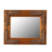 The Art-Deco-inspired Provins Mirror is surrounded by a square-shaped wood frame thick with ridges. Each corner of the frame features a large rose-and-leaf carving. The Provins Mirror frame is finished in an antique bronze hue that is faux-aged to look historic.